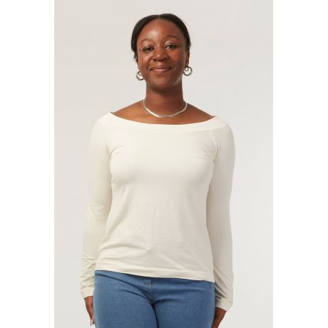 Ehola est un T-shirt intemporel à la ligne épurée et féminine, disponible en 4 déclinaisons : encolure danseuse ou en V, manches courtes ou longues. Sa coupe met en valeur le décolleté tout en offrant un confort absolu.