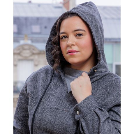 Ce modèle offre une multitude d’options pour s’adapter à toutes vos envies : choisissez entre un col ou une capuche et plusieurs finitions pour le bas : une taille élastique, un bord-côte ou une coupe droite. Avec 6 possibilités en un seul patron, Nyx s’impose comme un incontournable de votre garde-robe.
