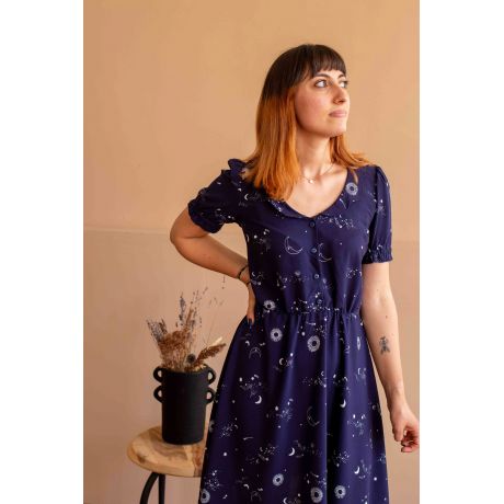 Comète de Lise Tailor est une robe délicate et raffinée. Boutonnée devant, élastiquée à la taille et dotée d’un col festonné, le patron propose 2 versions de manches ainsi qu’une version blouse.