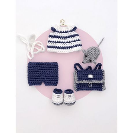 En choisissant cette pochette, vous allez pouvoir habiller et accessoiriser votre poupée au crochet avec une marinière, un short, des baskets, un ruban dans les cheveux, un cartable et une petite souris.