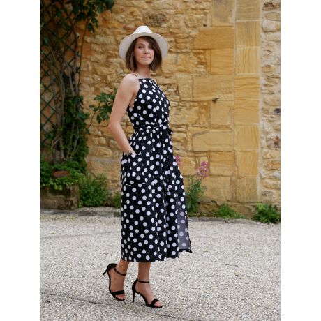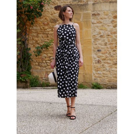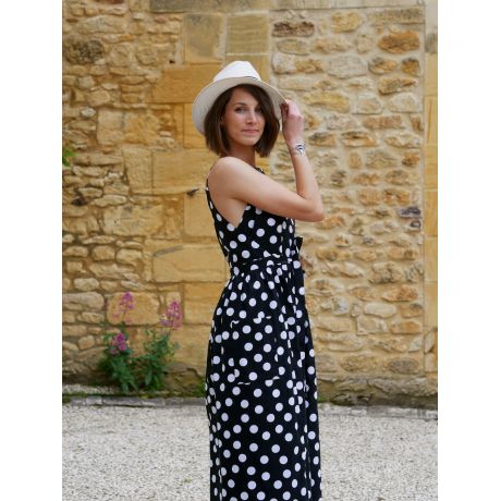 Sa particularité : son attache portefeuille revisitée avec le pan devant s’attachant dans le dos et le pan dos venant s’attacher à la taille avec sa ceinture à nouer, créant au passage, une jolie superposition au bas de l’emmanchure. Son buste structuré par des pinces taille devant et dos et des pinces poitrine, épousera parfaitement les formes du corps, pour un buste qui ne bouge pas. Ses larges poches rectangles sur la jupe viennent parfaire l’originalité de cette robe. Emy peut être réalisée en top en retirant la partie jupe.