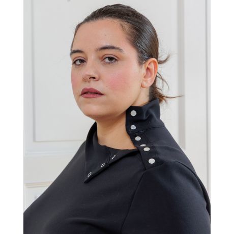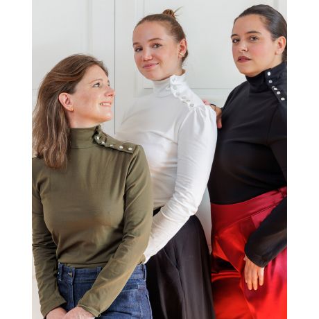Erell de Coralie Bijasson est le T-shirt à col montant et détail boutonné Élégant, moderne et facile à porter. Erell twiste le basique avec son col montant délicat et son boutonnage sur l’épaule gauche. Un clin d’œil couture qui signe la silhouette sans rien sacrifier au confort.