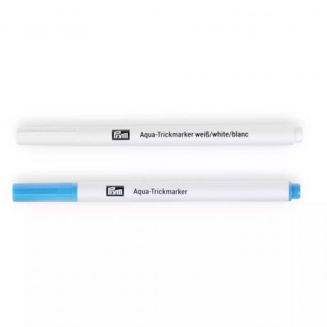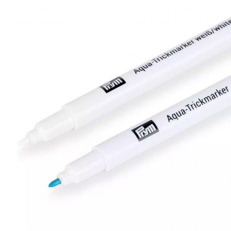 Le crayon à marquer est un feutre soluble dans l'eau soit en blanc ou en turquoise et doit être monté verticalement vers le bas avec le capuchon pour l'empêcher de sécher. Disponible en deux épaisseurs de mine, des lignes fines ou épaisses sur les tissus clairs et sombres peuvent être marquées facilement. Le aqua trick marker avec une ligne extra fine est disponible exclusivement en turquoise. Le kit comprenant un crayon à marquer blanc et un crayon à marquer turquoise, chacun avec une pointe standard, est particulièrement pratique.